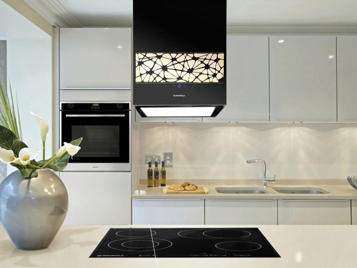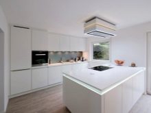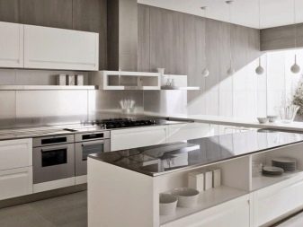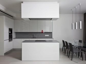 Trendy white kitchen sets are usually made with top shelves under the ceiling. And also they often use built-in appliances, integrated handles and exquisite large hoods, which are a kind of accent in the headset.