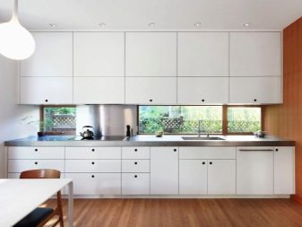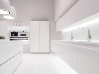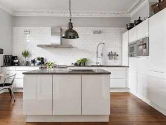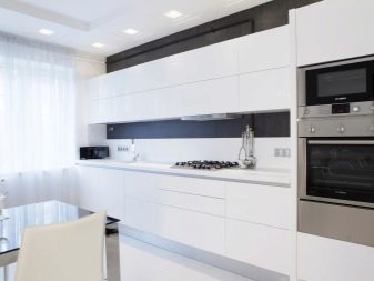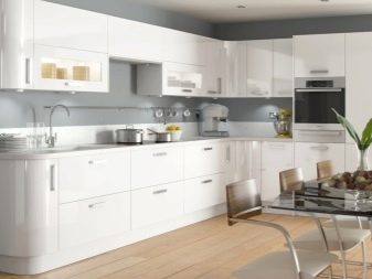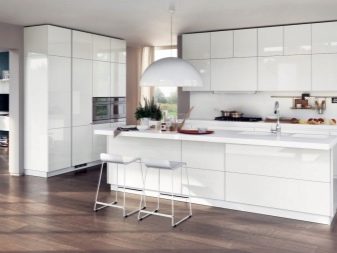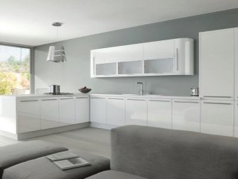 White kitchen sets can be either glossy or matte. It should be noted right away that the latter in terms of care are more practical and less easily soiled, because handprints are not visible on the matte surface, unlike glossy options. Moreover, glossy facades are more difficult to care for if they do not have classic handles for opening doors.