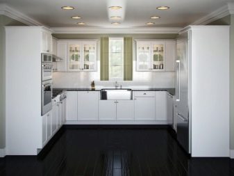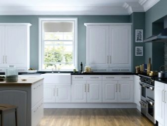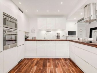 When creating an interior, the color of the walls should successfully harmonize with the selected shade., because white is very versatile, it has quite a lot of shades.If the room is made in eco-style, then you can supplement the white kitchen with the help of finishing materials (walls) with green shades or you can choose the natural color of the floor. Parquet and various laminate are welcome.