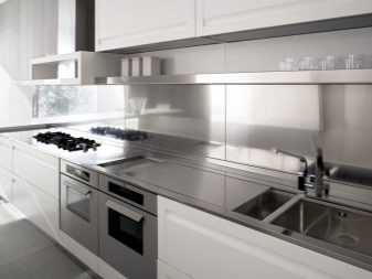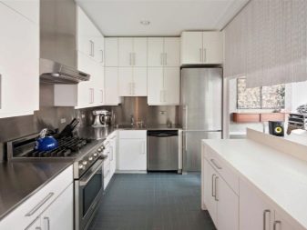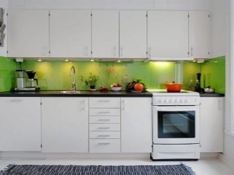 White kitchen sets are in perfect harmony with silver appliances and utensils. In terms of colors, you can experiment with a kitchen apron made of tiles. So, against the general white background of the kitchen set, it can be chosen bright. Very original solutions, such as lemon tiles or bright green, are also welcome.