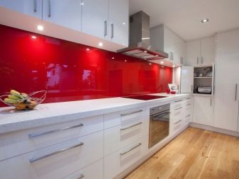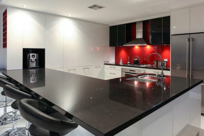 It looks very expensive black and white straight headset with a matte texture and a bright red glossy apron. At the same time, the countertop can be made both in black and white, but black will be more practical.