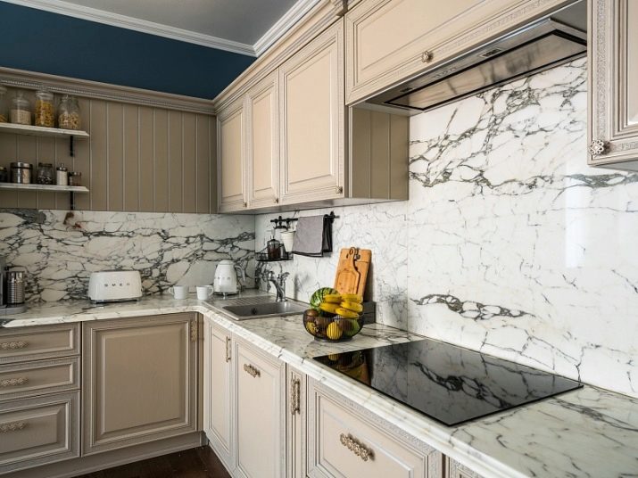 In the classic style, kitchen options with a marble apron look very attractive. Marble is successfully combined with natural wood. Usually marble imitation is made of large porcelain stoneware so that the joints are invisible.