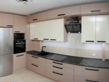 It can be used in different ways: you can buy a white and beige kitchen with upper white and lower beige cabinets. You can choose an option for a specific color headset composition. It also looks extraordinary.