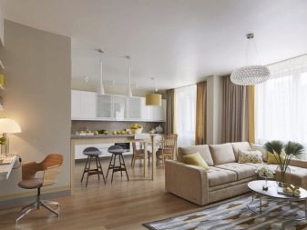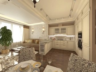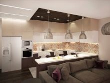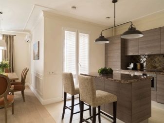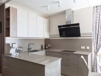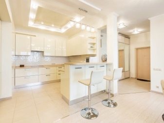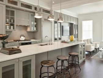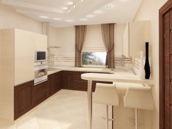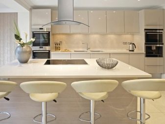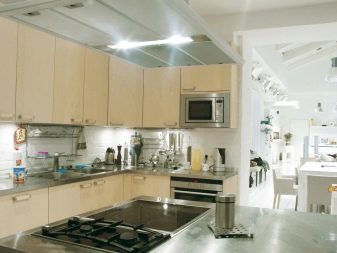 In the kitchens of the studio layout, headsets are installed in one of the corners of an open room. As a rule, this is the place where communications are made. It is preferable here to put models of the angular type, which, according to the reception of zoning of the space, will clearly limit the territory of this functional area.In order to save space and create a visual effect of space, it is preferable to supplement this kitchen with a bar counter with a set of bar stools.