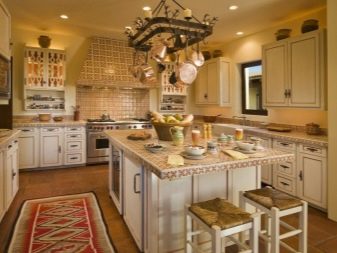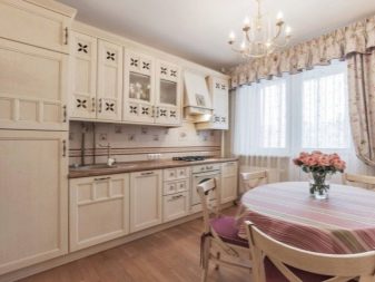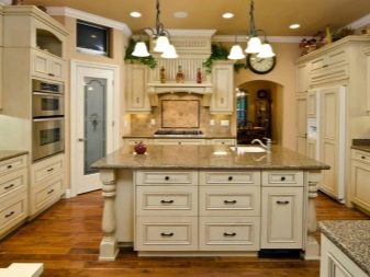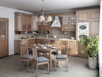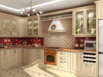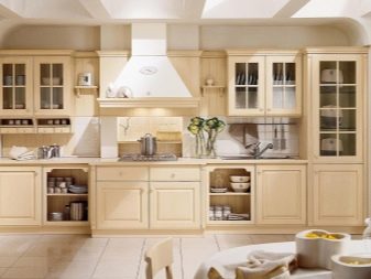 The set can be supplemented with rude wood furniture, as well as cast-iron fittings. In the kitchen, glass inserts may be present, which goes well with any material of the equipped kitchen.