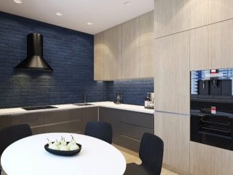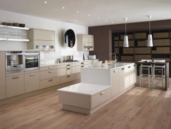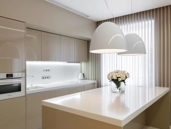 And also with a competent approach, it goes well with its kindred tones (from light to dark) and black. Choosing the contrast for the original color, one should not forget about the temperature of the headset: cold tones need similar companions. Therefore, a set of shades of cold beige looks great against the background of a gray-blue floor or an island with a similar color of facades.