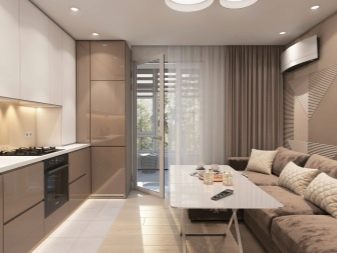 Such furniture is also suitable for arranging studio-style kitchens, as well as a room combined with a loggia or another room.