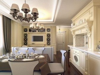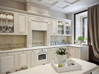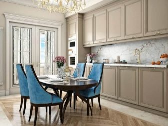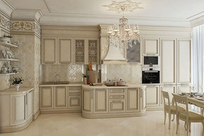 For example, if furniture is selected for the kitchen of any classical branch (including classics, neoclassicism, classicism), then it is important to demonstrate a certain solemnity, grandiosity of furniture. This is the presence of carved decor, stucco trim and gilded fittings. At the same time, we must not forget that a separate place will be given to the apron, as a result of which the color of the modular blocks should not merge into a single color spot.
