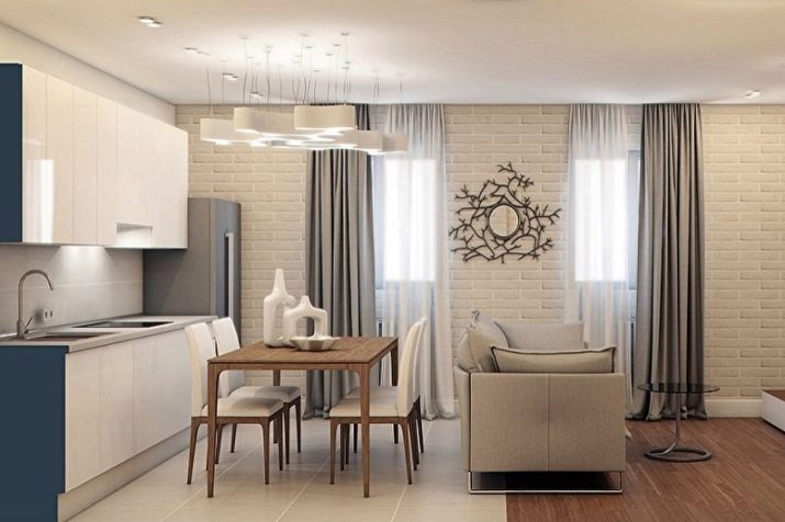 - Kitchen-living room of a modern style, made in a minimalist design.