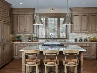 If the kitchen is made of wood, then you need to pay attention to the fact that the upper compartment has as few carvings or decorations. After all, caring for such a headset will be very difficult. Most often, all kitchen cabinets, which are made in the classical style, are elongated vertically.