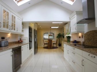 A 2-row kitchen is not so widespread as a corner, in the U-image, island and peninsular. However, for rectangular narrow rooms this can be an ideal exit. Also, a similar layout will be appropriate if the dining area is outside the kitchen.
