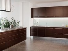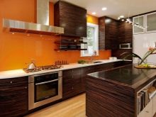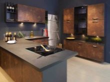 - But for the design of the kitchen in a modern style better to dwell on the imitation of dark wood, such headsets look especially impressive against the background of gray, graphite, beige and brown walls. An exceptionally noble and expensive impression is made by kitchens with walnut, oak, wenge or chocolate shades.