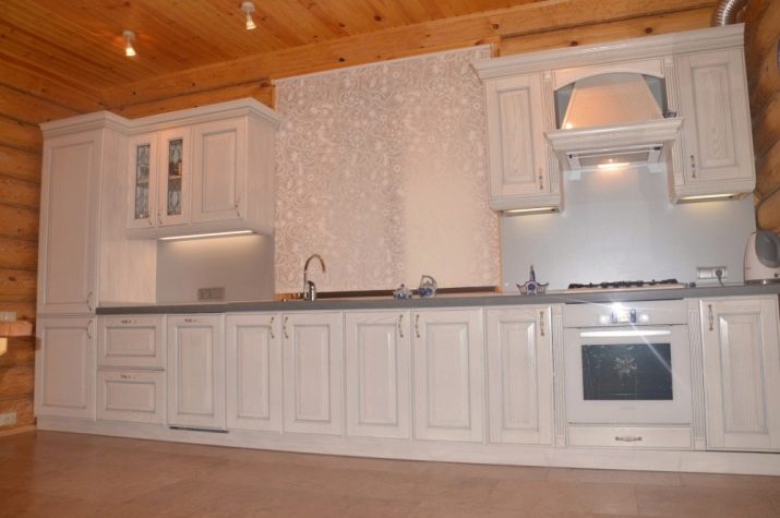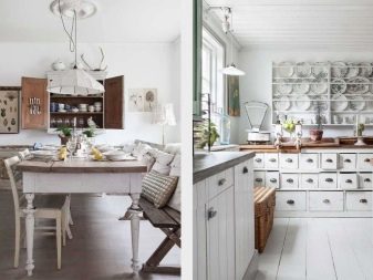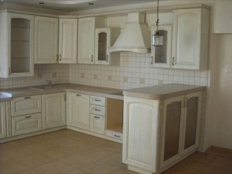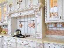 - Very original in the interiors look light "antique" headsets. Such options are ideally combined with the vintage and shabby-chic design trends - artificially aged MDF facades in white or light shades can become a real highlight of the kitchen decor.