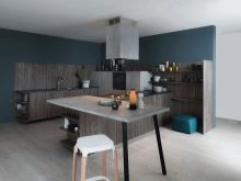 - island - in this version, one of the modules is taken out to the center of the kitchen: a dining table, a sink, a stove, a work area or a relaxation area; such options are optimal for spacious rooms with a footage of at least 15 square meters. m;