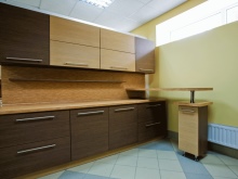 The most budgetary option is a chipboard - particleboard. It is made from sawdust and shavings and fastened with an astringent, and then pressed. The resulting plates are covered with decorative coatings, which give the facades a resemblance to wood. Commonly used are PVC film, veneer and plastic. The cheapest option is film, the other two options are slightly more expensive, but in any case, they all have an extremely short period of operation. peel off. Particleboard is susceptible to steam, heat and moisture, so the blocks located near the oven, hob and sink begin to warp over time, and the film