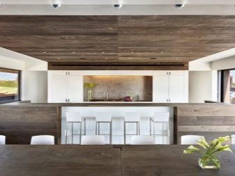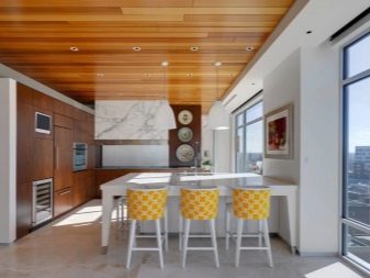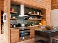 Often in kitchens, wood is used to clad not only the floor, but also the walls, and even the ceiling. This allows you to maintain the chosen style by 100%. If you have certain skills, you can make a kitchen under a tree with your own hands.