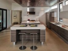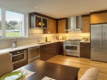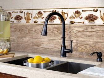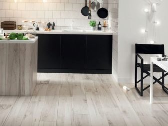 The use of wood-like tiles in the interior of a modern kitchen gives very good results. It reproduces the ornament and pattern of various wooden coatings. A sample can be not only a board, but also parquet and laminate. It is not necessary to choose a classic tile in the form of rectangles. Many copies are more likely to reproduce parquet or massive board in shape.