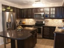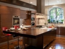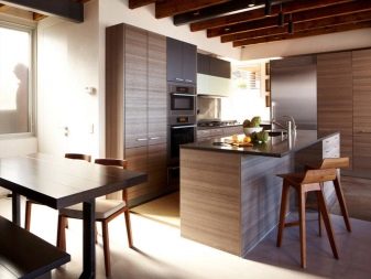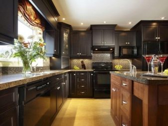 If you use wooden furniture in dark colors, it is advisable to supplement it with stone countertops. The floor and ceiling in this case make it noticeably lighter than the headset. Dilution of a monotonous composition is possible due to the use of contrasting ceiling beams. Too much furniture is not recommended. Revive the interior help potted plants.