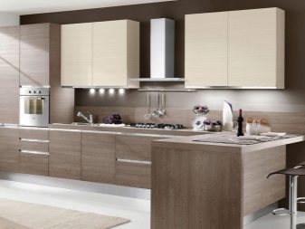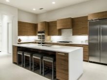 The oak veneer is beautiful. An annular pattern is clearly visible on its brownish surface. Light golden pine has a more complex pattern than oak. In addition, it better matches the canons of Russian national color. Choosing a Karelian birch, there is no doubt that the room will inspire thoughts about the elite level of the room and material well-being. But even better in a modern style, a kitchen with walnut or zebrano veneer is suitable.