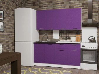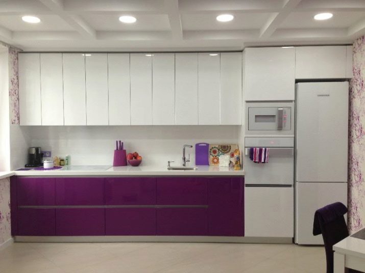 An interesting interior will turn out if you put a direct minimalistic set in a bright kitchen, in which the upper drawers are white and the lower ones are purple.A multilevel or embossed ceiling with built-in lamps, light wallpapers, complemented by delicate purple patterns will decorate the situation.