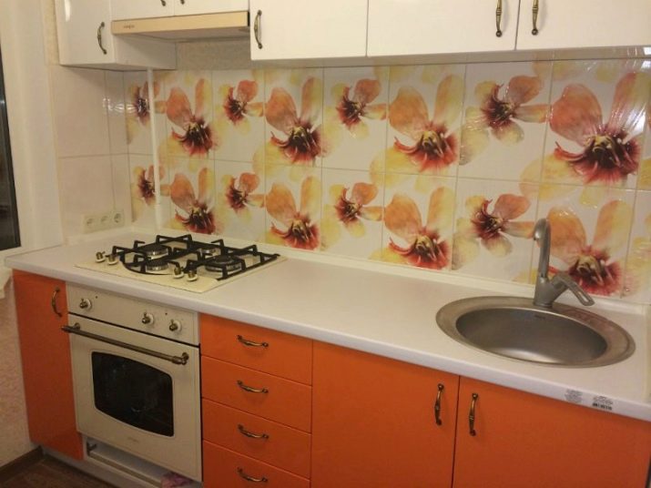 Today bright color headsets are in fashion. So, the direct kitchen, in which the lower drawers are orange and the upper (like countertops) - white, fits perfectly into a small room with beige wall decoration. On the floor you can lay a brown laminate. The interior will turn out to be more interesting and lively if you decorate it with an apron trimmed with tiles with the image of flowers in yellow and orange shades.