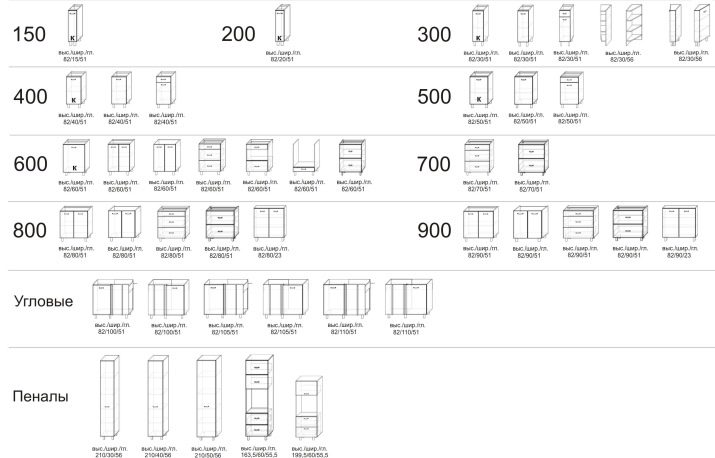 The most popular facade dimensions for kitchens can be seen in the table.