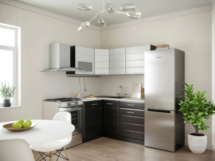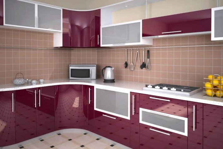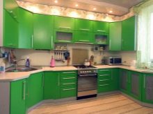 The kitchen set looks advantageous, in which the corner comes with rounded cabinets. This makes it possible to comfortably wash the dishes and use the sink. This streamlined shape looks good if there are cabinets with curved doors on one wall.