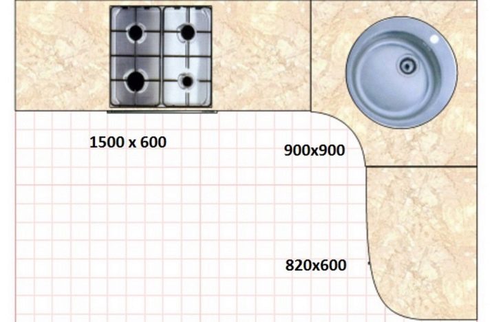 The structure is formed at the junction of two boxes, the base is a common horizon. The depth of the countertops that are at the junction with each other can be different. Worktops are well joined with a depth of 600x420 mm, 600x600 mm.