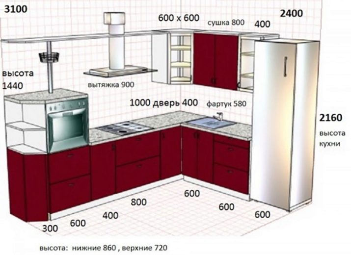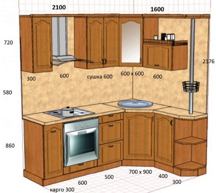 Individual planning can be done according to the drawings in a room with any size. You need to know the exact size of the kitchen, the location of the modules, design, individual preferences of the owner of the apartment. Below we will examine in detail the dimensions of corner cabinets.