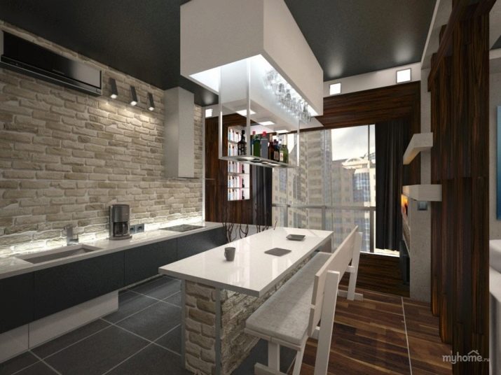 In small studios, the issue of saving space in the kitchen is also very important. The bar counter in this case is very well used for zoning the space, allowing you to separate the kitchen area directly from the living room. The headset can be straight or angular. This also applies to the combined kitchen-living room.