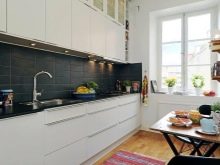 - A contrasting white apron will work well with black countertops. As a coating of the latter, plastic, glass panels or ordinary tiles can be used. But the standard piece materials here will be inappropriate.