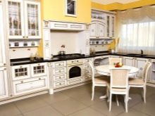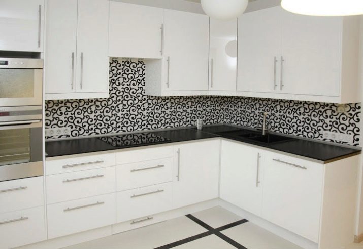 One of the most spectacular and stylish color combinations is a combination of black and white. Dark countertops of different textures look gorgeous in tandem with snow-white facades of kitchen sets. Such combinations can also be emphasized on other surfaces, for example, to add furniture with a white apron with black patterned curls, to lay a white tile with dark lines on the floor. In environments of this kind, warm lamp light is desirable. Hardware is better to choose metal.