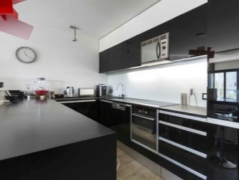- If you combine a black work surface with a light set, you can get a spectacular contrast, creating the effect of weightlessness.Due to this, the room as a whole will seem more spacious, especially if the surface of the countertops is glossy.