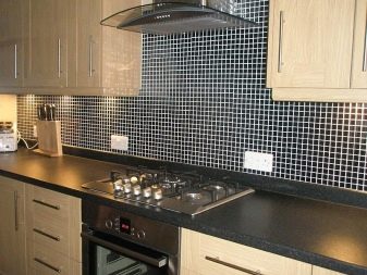 If the kitchen has a black countertop, then the apron for it is selected in the same color schemes. But such solutions are not always appropriate and everyone likes, because they can create too dark and dark design compositions. You can select other options for aprons.