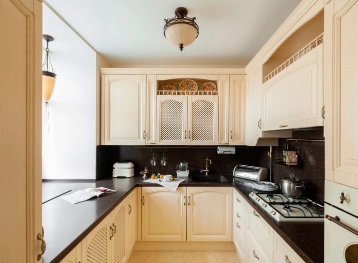 The classic corner kitchen with a milky hue will sparkle with new colors, if reinforced with black stone countertops and an apron made in the same color and texture. Against the background of such a tandem, the light finish of the kitchen will look spectacular. So that the black parts of the headset do not seem like "black sheep" in the interior, it is worth hanging dark metal lamps with large light shades - they will overlap with an apron and countertops.