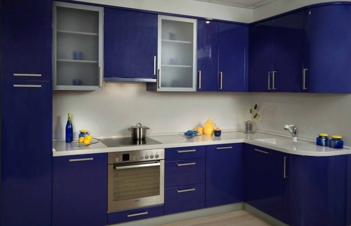 A dark blue kitchen with a bright white countertop will be an excellent solution for a bright interior. And yellow dishes will become a bright and original accent.