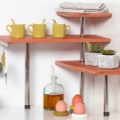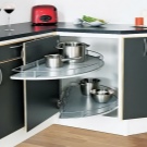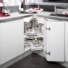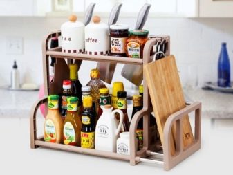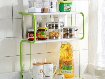 Such shelves may include from one to several tiers. Corner products are very convenient, especially for small kitchens. They occupy a corner unsuitable for other types of furniture. At the same time, the design looks compact, has good capacity.