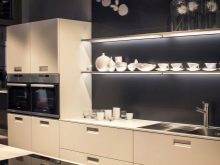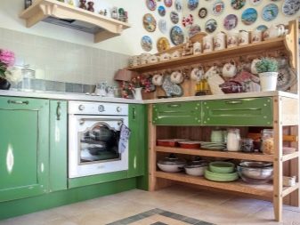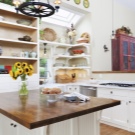 If the kitchen has a lot of decor and exhibition utensils, you should think about light open shelves. Massive closed shelves are selected for storage of pots and pans as additional storage places for the headset.