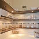 - Glass shelves with white utensils can decorate any wall. With proper lighting, the plates and vases seem to soar in the air.