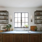 - A window in the working area is surrounded on two sides by shelves designed for dishes.