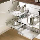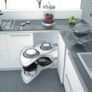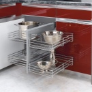 They are placed in the cabinets of the lower tier. Filing shelves is very convenient, they can be put forward, go on rollers, rotate and protrude from the stands. Depending on the location and model of the shelves, they are used for spices, detergents, for cans or bottles.