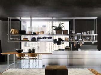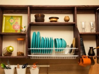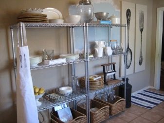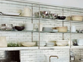 Most often they are made of metal. The plane of the shelves looks like an elegant lattice. Chrome options are placed above the sink, they perform the drying function for plates and cups.