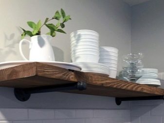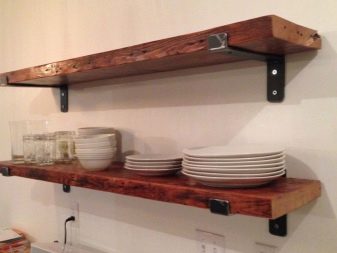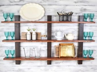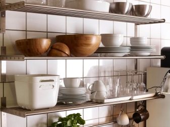If the shelves are used for spices or other small things, 1-3-level small structures made of wood, plastic or glass are suitable. Railing shelves (lattice) on chromed metal suspensions are good for small things. For a large number of dishes or for appliances, you should choose durable structures made from reliable material - wood or metal. In this case, angular structures are convenient - they take up little space, but have a large capacity.