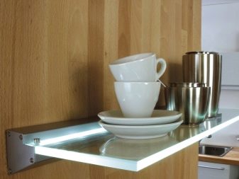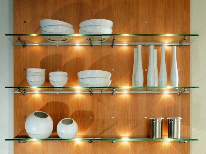 Illumination can make the shelves in the interior accent, draw attention to the decor. If the design is located in the working area, additional illumination is of practical importance.