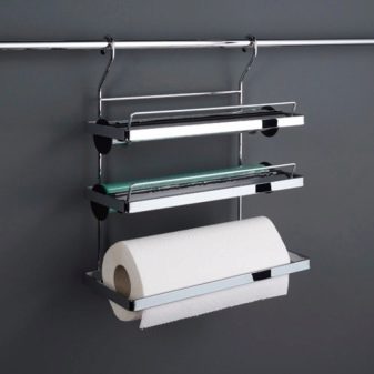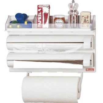 An unusual 4-in-1 shelf holder is very convenient for small kitchens. This small-sized device contains three roller shelves - for paper towels, cling film and bags, as well as an additional storage space for seasonings and other accessories.