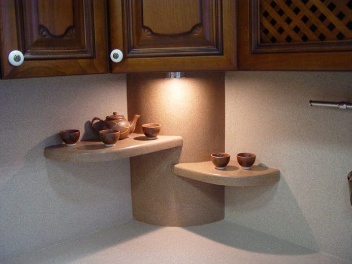 Shelves made of artificial and natural stone can rarely be found in the kitchen, although they suit many styles - rustic, historical, ethnic, techno. Stone refers to expensive and heavy materials. Large floor products are made to order. Miniature shelves made of artificial stone are fixed by a hidden method, they look unusual, as if glued to a wall.