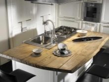 It is difficult to work with slabs from the massif: the tree can dry out, deform, and buyers will not like it. Therefore, they came up with a convenient option: glued wood, when the plates are formed from slab (natural wood boards) and glued together. Glued slabs are more obedient; they are not reduced by moisture or drying out, like solid wood products. Such material allows you to realize different ideas and configurations of furniture.Designers went further and proposed to make the countertop itself out of wood, and select the base from budget materials. So the purchase will be cheaper, but the beauty and properties of the tree will remain, and it will be even easier to bring, move and install a suite or kitchen island.