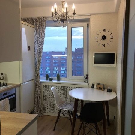 Since this is a small space, it would be good to consider the possibility of acquiring multifunctional tableequipped with additional drawers and other storage spaces. It is better to abandon thick countertops and dark details that form an unnecessary visual effect.