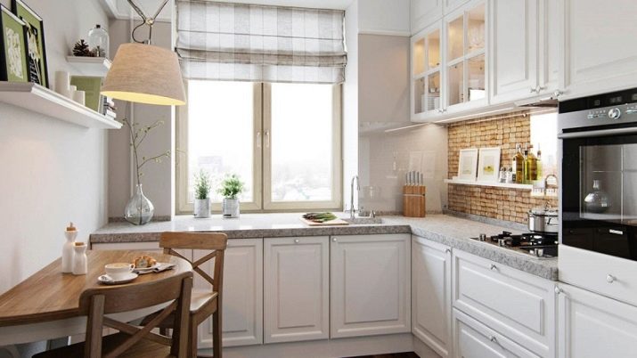 The corner table is considered the most ergonomic model, ideal for a small family. Do not forget about the table, smoothly passing into the windowsill. In all cases, it is recommended to purchase chairs that either slide freely under the table or are folded away for storage.