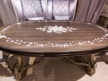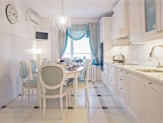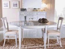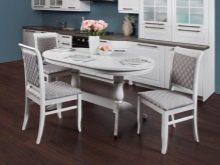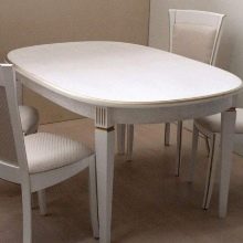 The table is made of solid wood, painted white, fits perfectly into the spacious kitchen, decorated in a classic style. In color, it is completely identical to the existing chairs, as well as the main headset. Large sizes allow you to place at least 6 people at the table. In addition, the dining area is highlighted with a classic design chandelier located directly above it. In a small kitchen, an oval table of the same white color, but with a sliding mechanism that increases the length of the surface, will be much more appropriate.